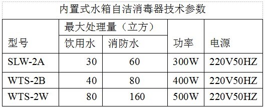本設(shè)備分為外置式、內(nèi)置SLW式、SLW-HB式兩種。內(nèi)置式SLW是安裝到水箱內(nèi)部的,控制柜在水箱外部安裝,機電混合器在水箱安裝,中間通過線纜、氣管連接。機電混合器內(nèi)有高效混合泵在水箱內(nèi)部以達到好的消毒。外置SLW-HB式主要安裝在水箱外部,內(nèi)置循環(huán)泵,水通過管道進入內(nèi)部消毒。消毒后的水經(jīng)回水管到水箱內(nèi)部。